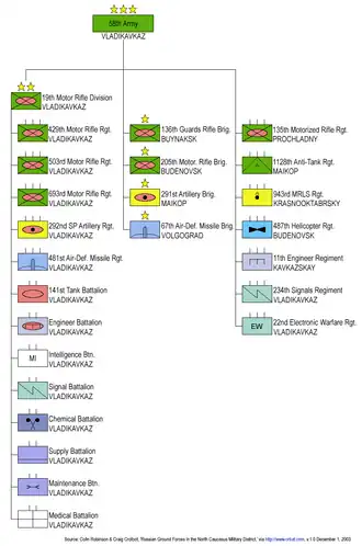 30. ^ Russian Ground Forces in the North Caucasus Military District v.1.0 1 December 2003, Colin Robinson (editing and some text), Vadim Teplitskiy(unit list), and Craig Crofoot (history text), via http://www.orbat.com Archived 16 November 2018 at the Wayback Machine