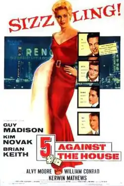 5 Against the House is a 1955 American heist film directed by Phil Karlson and starring Guy Madison, Kim Novak, Brian Keith and William Conrad. The screenplay is based on Jack Finney's 1954 novel of the same name, later serialized by Good Housekeeping magazine.[1] The film centers on a fictional robbery of Harold's Club, a real Reno casino.
