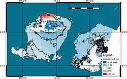 Days following the earthquake, scientists from NASA and California Institute of Technology published a satellite image of the ground shift in Lombok. The image showed that the area in the earthquake's rupture had been lifted by 25 cm. Several portions of North Lombok were raised by 5–10 cm. The area which was located on the south of the rupture however had a decrease on its height, including Mount Rinjani which had lost 15 cm due to the earthquake.[31]