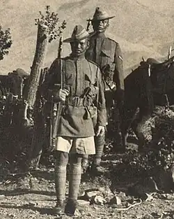 During the First World War, the regiment primarily saw service in the Middle East—the 1st Battalion saw extensive and hard service at Gallipoli in 1915[5] (where seven officers and 129 men were killed in the first few hours after the battalion landed).[7] During the withdrawal, ‘C’ company of the 1st Battalion, 5th Gurkhas were among the last troops to leave.[8]
