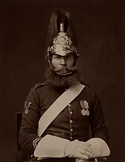 Redesignated heavy cavalry, it was sent to the Crimean War in 1853 and fought in the October 1854 Battle of Balaclava.[7] The Charge of the Heavy Brigade was a famous action but casualties were relatively light; the Brigade as a whole lost 92 dead and wounded in total, 15 of whom came from the 5th Dragoon Guards.[12] A small detachment joined the 1885 Nile Expedition in 1885 but its next serious action was during the 1899–1902 Second Boer War, when it fought at the battles of Elandslaagte and Ladysmith.[13]