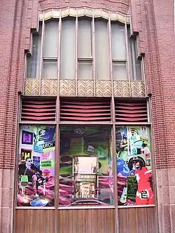 The West Broadway elevation is designed similarly to the "screen" on the Hudson Street elevation. There is a centrally positioned entrance with five doors, a bronze lintel, and a glazed window with diagonal muntins. Three storefronts are on either side of the doorway on West Broadway; at the second story, two of these storefronts contain curtain-shaped windows, and the third contains a pair of sash windows set between vertical brick piers.[16] On the Worth Street elevation, there are storefront windows at either end. The central section of the Worth Street elevation contains triple-hung windows, which concealed an auditorium inside.[26] On Thomas Street, there are two storefront windows on the easternmost bays, as well as two double-height loading docks. The remaining bays on Thomas Street contain rectangular windows or ventilation grates, which are set between brick piers.[26]