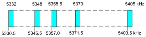 It does not require stations to adopt the USB dial frequencies of 5354, 5357, 5360 and 5363 kHz but these frequencies provide a good fit with the American channel on 5357 kHz, and UK stations which can use 5354 and 5363 kHz but not 5360 kHz.[8] Also, it is only by using these exact frequencies that there will be enough room for four simultaneous SSB conversations without mutual interference, assuming the 2.8 kHz de facto standard bandwidth of typical SSB transceivers.