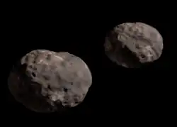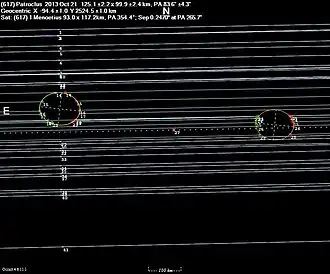 In 2001, it was discovered that Patroclus is a binary system, made up of two components of roughly similar size.[9][22][23] It is one of six Trojan asteroids believed to be binary. In 2006, accurate measurements of the orbit from the Keck Laser guide star adaptive optics system were reported.[24]