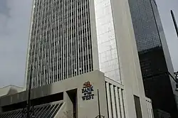 At the time of its completion, 621 17th Street was known as "First National Bank Building", its primary tenant.[4] After First Interstate merged with Wells Fargo in 1996, the building's official name became its address.[4] The 434-foot (132 m) First Interstate Tower North, now known as 633 17th Street, was built adjacent to First Interstate Tower South in 1974.[5] The two buildings together form the First of Denver Plaza.[6] The building with the First of Denver logo can be seen in the opening credits of the television show Dynasty.