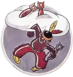 - ^ Approved 29 December 1943. Description: On a light grayed turquoise blue disc, thin border of the same [color] piped white, a caricatured Indian warrior proper, wearing light red trousers, yellow moccasins, red, yellow, and blue head band with one red and one yellow feather, hanging by the right arm from a large white cloud formation in chief, while holding a blue violet aerial bomb in the left hand; cloud formation supporting two aerial bombs, one red violet and one orange.