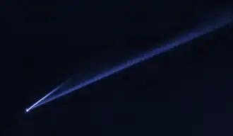 On January 5, 2019, it was discovered that Gault possesses a comet tail, which had not been present in previous images taken during the 2018/19 opposition.[13][9] The asteroid began to break up as its spin accelerated due to the YORP effect, and its rotation speed approached two hours – near the limit of stability for an asteroid. The ejected matter created two dust tails,[14] and the longer one has been estimated at over 800,000 km (500,000 mi) long. Earlier hypotheses of a collision with another asteroid were ruled out as a source of the tail-forming dust, and its two tails were believed to be a result of sudden dust ejections near October 28 and December 30, 2018.[9] It is also possible that solar heating caused sublimation of ice, perhaps beneath the surface in a "pocket", and the force of the ejection of material (after being exposed to solar heating during the rotation of the asteroid) resulted in the spin rate increase. A prior example of such an occurrence is in the literature.[15]