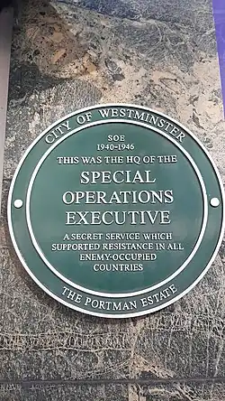 The building was completed in the first half of the 20th century and, after becoming part of the Government estate, was let to the Prison Commission.[1] It became the headquarters of the Special Operations Executive in September 1940.[2] A plaque on the building's face gives details of its former inhabitants.[3]
