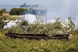 In April 2014, the corps was reinstated on the basis the units already stationed in Sakhalin and the Kuril Islands: the 18th Machine Gun Artillery Division and the 39th Separate Motor Rifle Brigade,[8] under the command of Major General Valery Asapov. The 676th Separate Engineer Battalion was formed later that year.[9] In July 2015, Major General Alexander Peryazev took command after Asapov transferred to the Southern Military District.[10] and, according to Main Directorate of Intelligence of the Ministry of Defence of Ukraine as well as other sources, under the alias of "Primakov" participated in the Russian military intervention in Ukraine as commander of the Donetsk People's Republic's 1st Army Corps.[11][12] The corps moved to a full contract manning system from August 2016.[13] In February 2017, Major General Dmitry Glushenkov became commander of the corps, replacing Peryazev, who became commander of the 20th Guards Army.[14]