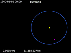 The asteroid has an Earth minimum orbital intersection distance of 0.0041 AU (610,000 km) which translates into 1.6 LD.[4] On 30 October 1937, Hermes passed 0.00494 AU (739,000 km) from Earth, and on 26 April 1942, 0.0042415 AU (634,520 km) from Earth.[21] In retrospect it turned out that Hermes came even closer to the Earth in 1942 than in 1937, within 1.7 lunar distances; the second pass was unobserved at the height of the Second World War.[21] For decades, Hermes was known to have made the closest known approach of an asteroid to the Earth. Not until 1989 was a closer approach (by 4581 Asclepius) observed. At closest approach, Hermes was moving 5° per hour across the sky and reached 8th magnitude.