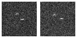 69230 Hermes is a sub-kilometer sized asteroid and binary system on an eccentric orbit,[10] classified as a potentially hazardous asteroid and near-Earth object of the Apollo group, that passed Earth at approximately twice the distance of the Moon on 30 October 1937. The asteroid was named after Hermes from Greek mythology.[3] It is noted for having been the last remaining named lost asteroid, rediscovered in 2003. The S-type asteroid has a rotation period of 13.9 hours.[7] Its synchronous companion was discovered in 2003. The primary and secondary are separated by 1.1 km (0.68 mi) and are similar in size; they measure approximately 600 ± 120 meters (2,000 ± 390 ft) and 540 ± 120 m (1,800 ± 390 ft) in diameter, respectively, with a combined effective diameter of 810 m (2,700 ft).[5]