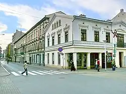 The street was gradually extended, and by the 1870s, it ended near Wiązowy Market (later Green Market, now Norbert Barlicki Square), before the planned Pańska Street (now Stefan Żeromski Street). In 1870, two corner tenement houses were built at the intersection with Piotrkowska Street (at No. 1/3 and 63 Piotrkowska Street). These were erected by Karol Kretschmer, who owned a handkerchief weaving mill there since 1857, one of the oldest factories in Łódź. Most of the parcels on the north side of the street belonged to him.[12][13] That same year, a corner building at No. 2 and 65 Piotrkowska Street was constructed, where Szaja Rosenblatt opened a wool spinning mill three years later.[14]