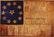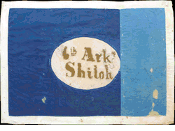 The earliest flag known for the 6th Arkansas is a 1st pattern Hardee (Buckner) battle flag- 28" x 38", no white border on three sides, and only a 2" white border on the staff edge. (See Battle Flags of the Confederate Army of Tennessee, p. 55) This flag is in the collections of the Smithsonian Institution in Washington, DC; accession no. 18342. This flag (according to its file card) "was made by a soldier of the Sixth Arkansas, from remnants of blue and white shirts." The blue field is extensively pieced.[32]