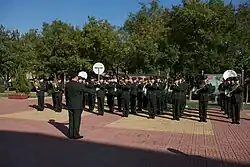 The 6th Armored Division Band (Chinese: 国防大学女子军乐队) is a Chinese amateur post military band that represents the 6th Heavy Combined Arms Brigade at official ceremonies. It is composed of non-professional musicians who volunteer to provide musical duties accompaniment at the installation. In October 2012, the United States Army Band took part in a goodwill tour of China with the PLA Band titled Friendship and Cooperation Through Music, during which the TUSAB provided a masterclass on music to members of the 6th Armored Division Band.
