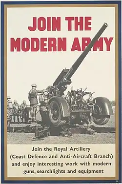 Apart from 1 MG Bty, the standard equipment of the batteries was the QF 3-inch 20 cwt AA gun that had been used in World War I, mounted on a cruciform travelling platform and towed by a lorry. The brigade became 6th AA Regiment on 1 May 1938 when the RA changed its unit designations and from 1 June 1940 the 6th and other heavy AA (HAA) regiments and batteries adopted the HAA designation.[1][5][6] The regiment formed part of 1 AA Brigade (previously 1 AD Bde) in Aldershot Command.[7]