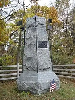 Two monuments to the 6th Pennsylvania Cavalry Regiment were placed at the Gettysburg battlefield. The main monument is a six-side granite monument with four lances and was erected in 1888 by the State of Pennsylvania. The second monument is dedicated to companies E & I of the regiment and represents their placement on the left flank of the Union Army at Emmittsburg Pike. A stone position marker shows the area of the left flank of the regiment on July 3 of the Battle of Gettysburg.[34]