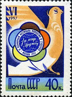 The 6th World Festival of Youth and Students was held from 28 July to 5 August 1957 in Moscow, capital city of the then Union of Soviet Socialist Republics. The festival attracted 34,000 people from 130 countries. This became possible after the political changes initiated by Nikita Khrushchev. It was the first World Festival of Youth and Students held in the Soviet Union.