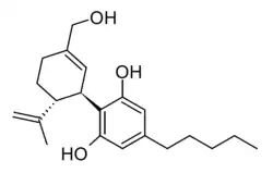 7-Hydroxycannabidiol (7-OH-CBD) is an active metabolite of cannabidiol, generated in the body from cannabidiol by the action of the enzyme CYP2C19.[1] While methods have been developed for its synthetic production,[2] and measurement of levels in the body following consumption of cannabidiol,[3] its pharmacology has been relatively little studied, though it has been found to possess similar anticonvulsant effects to cannabidiol itself,[4] as well as lowering blood triglyceride levels. Like its precursor CBD, it is not known to exhibit any psychoactive effects on the body and is known to counter the psychoactive effects of THC if it is present at the same time. This mode of action in 2015 was discovered to be at least contributing in part by being a non competitive negative allosteric modulator of the Cannabinoid receptor type 1.[5]