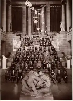 The picture was published by LIFE in their June 20, 1949, edition, covering most of pages 112 and 113. That the picture used most of two pages was in itself unusual. The photograph was part of the magazine's coverage of the 3rd Sculpture International exhibition, which was organized by the Fairmount Park Art Association (now the Association for Public Art) and held at the Philadelphia Museum of Art from May 15 to September 11, 1949. The picture shows 70 of the 254 sculptors whose work was being displayed, as well as a fair number of their pieces.[1]