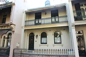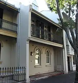 A well proportioned Victorian house, some Italianate features. In almost intact condition this building now contains four 1 bedroom units. Storeys: Two; Construction: Painted rendered masonry walls, slate roof to main body of house, corrigated galvanised iron to balcony verandah, and rear wing. Cast iron balcony lace. Style: Victorian Italianate.[1]