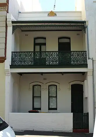 Two storey, four bedroom Victorian terrace. Infilled balcony with iron lace balustrade and valence on upper storey. Storeys: Two; Construction: Painted rendered masonry, corrugated galvanised iron roof, painted timber joinery. Style: Victorian Italianate.[1]