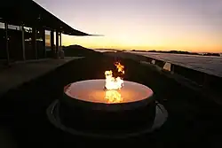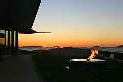 The 747 Wing House was built on the site where existing Duquette structures had burned. Some of the materials from the previous building were used as walkways.[8] The use of the existing pad minimized site grading. The foundation used many of the existing concrete retaining walls but they were rebuilt and reinforced as required to meet new code regulations. This greatly reduced the amount of concrete needed to make the foundation and new walls. Because the wings are only supported in four primary places to the ground, the foundation was further minimized. Both main wings are held up entirely by the four large mounts that the engines originally hung from. By designing the weight distribution on the mounts, it allowed for the outside walls of the building to be made of high efficiency self-supporting glass instead of conventional load-bearing wooden walls. This maximizes solar gain for heating and allows the entire building to be opened to the outside. This also keeps it cool in the summers and minimizes the need for artificial light.[5]