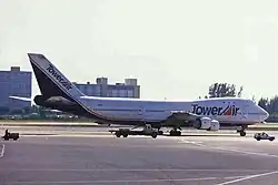 The Boeing 747-100 was a Trans World Airlines (TWA) aircraft registered N93106. Its construction number was 19672 and it was the twenty-eighth 747 built.[9] Boeing delivered the 747 to TWA on April 3, 1970, at a cost of approximately $25,000,000. It flew with TWA until 1992, when it was retired to the old El Mirage Air Force Base, before being purchased by Tower Air for its scrap value of $30,000.[10]