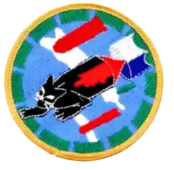 - ^ Approved 15 August 1944. Description: Over and through a light blue disc, broken line segment border medium green, a large red aerial bomb falling toward dexter base, tail fins in graduated shades of gray and blue, nose taking the form of the head and shoulders of a black leopard, with expression of anger on face, between a red violet aerial bomb in dexter chief, and a yellow green and red violet aerial bomb in sinister base, all in front of two white cloud formations.