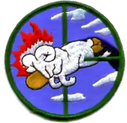 - ^ Approved 9 April 1945. Description: Over and through a light pastel blue disc, flecked with white clouds, border green, a white mountain goat, outlined black, leaping in medium blue arc from sinister base through center of green cross hairs toward dexter and leaving large, jagged red and white impact mark emanating from horns, all in front of a large yellow aerial bomb following trajectory of mountain goat's leap.
