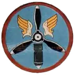 - ^ Approved 20 August 1960. Description: On a sky blue disc bordered Air Force golden yellow, two white lightning flashes saltirewise throughout issuing from sinister chief above an Air Force blue parachute highlighted sky blue; surmounting the flashes a red flying carpet bendwise, fringed Air Force golden yellow leaving speed lines Air Force golden yellow to sinister; over all an Air Force golden yellow spear bendwise its head extending beyond the border in dexter its shaft surmounted by a white helmet shaded sky blue, plumed Air Force blue; outlines and details Air Force blue throughout.