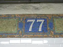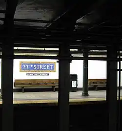 There are round columns painted green along the length of both platforms.[34] There are mosaic trim lines, and mosaic displaying the name of the station on the original sections of the station platforms.[35][36] The remainders of both platforms have cream-colored tiles and a salmon trim line with "77TH ST" written on it in black Sans Serif font at regular intervals.[37] These tiles were installed during the late 1950s renovation. Fixed platform barriers, which are intended to prevent commuters falling to the tracks, are positioned near the platform edges.[38][39]