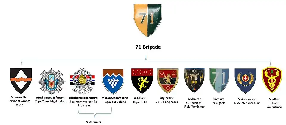 71 Motorised Brigade was established in Cape Town (in the Western Province Command area). Units transferred from Western Province Command to the new 71 Motorised Brigade included the Cape Field Artillery, the Cape Town Highlanders, Regiment Westelike Provinsie, Regiment Boland, Regiment Oranjerivier, South African Engineer Corps 3 field squadron, 74 Signal Squadron SACS, 4 Maintenance Unit SAOSC, 30 Field Workshop SAOSC, and 3 Field Ambulance.[5]: 16 12 Supply and Transport Company, originally established on 22 August 1961, became 4 Maintenance Unit on 1 September 1971.
