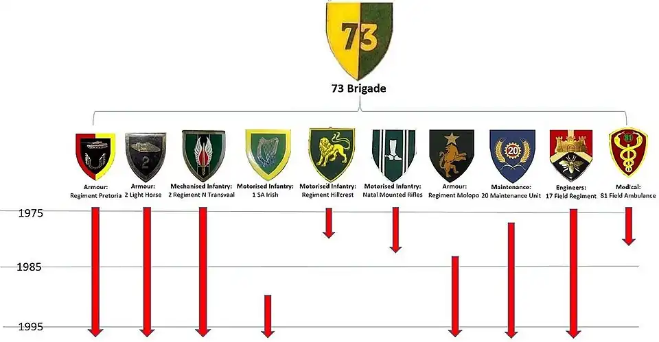 8th South African Armoured Division's Brigades were disbanded in 1992 and the Battalions and Regiments came to answer directly to the Divisional headquarters. The Division itself was effectively disbanded on 1 April 1997, when its former units became part of 7 South African Division as 74 Brigade.