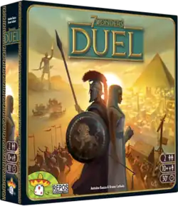 7 Wonders Duel is a 2015 two-player strategy card game designed by Antoine Bauza and Bruno Cathala with art from Miguel Coimbra. A spinoff of 7 Wonders, the game was published by Repos Production and achieved commercial success.