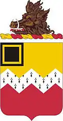 The dual character of the regiment is shown by the colors of the field, yellow for cavalry, red for artillery. The fess dancetté is taken from the arms of the Oglethorpe family, also the boar's head crest, which in addition is the ancient symbol of hospitality. The arms of ancient Brittany was a shield of ermine, and ermine figures prominently in the arms of Vannes; this is shown by the tincture of the fess. The parent organization is shown on the canton.