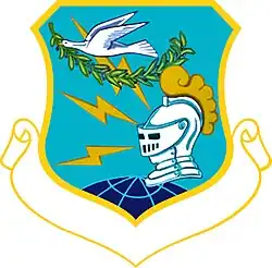 - ^ Approved 26 April 1960. Description: Light blue, issuant from base, portion of a globe azure with grid lines of the first [color mentioned] surmounted to sinister by a knight's helmet argent plumed or and in dexter flank three lightning flashes of the last [color mentioned] radiated from sinister nombril in chief a dove volant carrying in its beak an olive branch, all within a diminished border of the fourth [color mentioned].