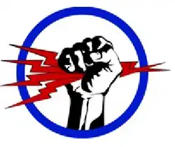 - ^ Approved 11 July 1942. Description: On a white disc, encircled by a blue annulet, issuant from base, a dexter arm from the wrist grasping a four pronged thunderbolt extending across and over the annulet.