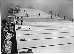 HMS Fencer served as an escort for an Arctic convoy, during which it engaged eleven German U-boats, successfully sinking three: U-277 on 1 May, followed by U-674 and U-959 the following day.[4] In July 1944, the squadron was reorganised, with six Fairey Swordfish aircraft assigned to Implacable-class aircraft carrier, HMS Indefatigable and three to the modified Courageous-class battlecruiser to aircraft carrier, HMS Furious. These aircraft launched attacks on the German battleship Tirpitz, while the remaining Fairey Swordfish and Grumman Wildcat aircraft stayed with HMS Fencer to escort a convoy to Gibraltar. The Grumman Wildcat fighters, reduced to four, remained with the carrier until their transfer to the Nairana-class escort carrier, HMS Campania in October 1944. Meanwhile, the Fairey Swordfish were consolidated under RAF Coastal Command in September 1944 for operations in Scotland.[3]