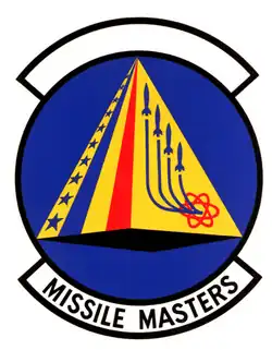 - ^ Approved 4 October 1960. Description: On a white dart-shaped area, its apex pointing upward, a black dart-like area issuing from base; three stripes issuing from the black area in dexter base, and diminishing to a vanishing point in chief, blue, white, and red, between, in dexter, nine Air Force blue stars diminishing in size to chief and having three guided missiles in flight to chief leaving trails, Air Force blue, in the center of an atomic symbol of three red orbits in sinister base. Significance (1982): The overall theme of the emblem is based on unity of the weapon system and the training mission of the squadron. The color forest green represents the mobility of the weapon system. The blue stripe and stars rising to the apex represent excellence in training. The red stripe rising to the apex and the red atomic symbol represent the capabilities of the weapon system.
