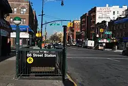 The 86th Street station is a station on the BMT Fourth Avenue Line of the New York City Subway, located at 86th Street and Fourth Avenue in Bay Ridge, Brooklyn. It is served by the R train at all times.