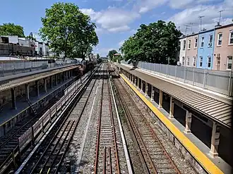 The 86th Street station (also known as the Gravesend–86th Street station) is a local station on the BMT Sea Beach Line of the New York City Subway, located at the intersection of 86th Street and West Seventh Street in Gravesend, Brooklyn.[4] It is served by the N train at all times. During rush hours, several W trains also serve the station, which serves as the southern terminus for W trips to Brooklyn.[5]