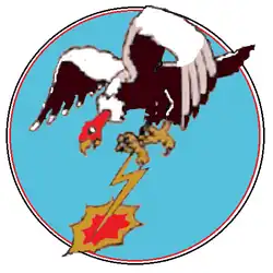- ^ Approved 16 May 1945. Description: On a light turquoise blue disc, border triparted red, white, and black, a caricatured, brown and white condor with red head and yellow orange beak and feet, in flight toward dexter, hurling a yellow orange lightning flash with the feet striking in dexter base at large, irregular red-and-yellow orange blazing target, edged black.