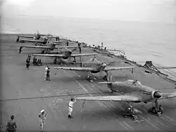 The squadron embarked on the escort carrier Ruler in December 1944,[10] with Ruler meeting up with the British Pacific fleet in April 1945.[11] Ruler was tasked with providing fighter and anti submarine protection for the Fleet Train replenishment ships supporting the fleet, with 885 Naval Air Squadron supplementing its eighteen Grumman Hellcats with four Grumman Avenger torpedo bombers for anti-submarine duties.[11][12] On 14–15 May, the squadron provided air cover while the British Pacific Fleet replenished during the Battle of Okinawa, with the squadron's aircraft also being used as targets to train the fleet's fighter controllers and anti-aircraft gunners.[13]