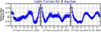 - ^ a b Machado, L. Fox; Michel, E.; Hernandez, F. Perez; Pena, J. H.; Li, M. A.; Pau, S.; Fernandez, A.; Michel, J. P.; Michel, R.; Pani, A. (August 2007). "Multisite Observations of δ Scuti Stars 7 Aql and 8 Aql (a New δ Scuti Variable): The Twelfth STEPHI Campaign in 2003". The Astronomical Journal. 134 (2): 860–866. arXiv:0706.0576. Bibcode:2007AJ....134..860F. doi:10.1086/520062. S2CID 15349358.