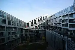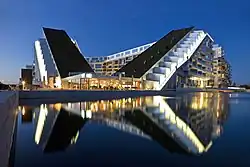 The scheme was based on the typology of a perimeter block but was squeezed in the middle to form a bowtie shape with two courtyards. At the centre, there is a 10-metre-wide passage connecting the surrounding spaces, the park area to the west and the channel area to the east.[4] The retail and commercial area at the base consists of a café, a day-care centre and offices, while the living space with houses, apartments and penthouses is positioned above. The sloping, 10-storey building provides views over the fields and marshes of Kalvebod Faelled to the south. The unusual ramp looping around the complex is designed to foster a sense of community, encouraging interaction between neighbours.[5][6]
