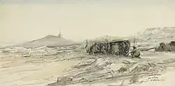 After landing at Alexandria between 18 and 22 June, 60th (2/2nd L) Division moved to the Suez Canal to join the Egyptian Expeditionary Force (EEF), where its units were reorganised (the BACs were absorbed into the DAC once more) and underwent training before crossing Sinai in early July 1917. Further intensive training followed until late October, when the division made its first full-scale attack of the war, at Beersheba. In the weeks leading up to the attack artillery officers had regularly ridden close to the Beersheba defences to reconnoitre, often under fire. Concentration for the attack was carried out under cover of darkness, beginning on 20/21 October and completed on 28/29 October. The divisional artillery was divided into Right and Left groups corresponding to the two attacking brigade; CCCIII Bde was part of Right Group supporting 179th (2/4th London) Brigade. The whole force moved forward under moonlight on 30/31 October, with the Royal Engineers improving the track north of Wadi ed Sabe for the artillery, which was in position by 01.30. At dawn the guns began to bombard Hill 1070, pausing at 07.00 to let the smoke and dust clear. Right Group then resumed its wirecutting and at 08.30 the guns switched to intensive bombardment, 179th Bde moving forward as the guns lifted. By 13.00 the whole of the defence works were in British hands, and that evening the Desert Mounted Corps entered Beersheba.[20][61][62]