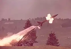 The regiment was reformed in 1955 as 3rd Heavy Artillery Regiment and served as a support unit for the III Army Corps. In 1959 the regiment was equipped with MGR-1 Honest John rockets and in 1960 it was renamed 3rd Missile Artillery Regiment. The regiment was assigned to the III Missile Brigade, which consisted of the Italian Army's units with a nuclear weapons mission. The US Army's 559th Artillery Group stored the W31 nuclear warheads for the regiment's battalions at four sites in Northern Italy. In 1974 the regiment was reduced to a single group, which was re-equipped with MGM-52 Lance tactical ballistic missiles. In 1975 the regiment was disbanded and the remaining group became an autonomous unit, which was renamed 3rd Missile Artillery Group "Volturno" and assigned the flag and traditions of the 3rd Heavy Artillery Regiment. The group's nuclear mission came to an end in 1992. The same year the group was reorganized as 3rd Heavy Artillery Regiment "Volturno" and equipped with M270 Multiple Launch Rocket Systems. In 2001 the regiment was disbanded and its personnel and materiel transferred to the 5th Field Artillery Regiment "Superga".[1][2] The regimental anniversary falls, as for all Italian Army artillery regiments, on 15 June, the beginning of the Second Battle of the Piave River in 1918.[1]