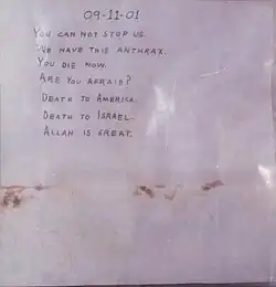 The 2001 anthrax attacks, also known as Amerithrax (a portmanteau of "America" and "anthrax", from its FBI case name),[1] occurred in the United States over the course of several weeks beginning on September 18, 2001, one week after the September 11 attacks. Letters containing anthrax spores were mailed to several news media offices and to senators Tom Daschle and Patrick Leahy, killing five people and infecting seventeen others. Capitol police officers and staffers working for Senator Russ Feingold were exposed as well. According to the FBI, the ensuing investigation became "one of the largest and most complex in the history of law enforcement".[2]