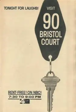 90 Bristol Court got its name from the fact that the program ran 90 minutes and the initials of Ninety Bristol Court spelled "NBC." The programming idea behind it was that viewers would be inclined to stay tuned to NBC for 90 straight minutes if they were watching three half-hour situation comedies marketed as a single block of programming and having a common theme of taking place in the same locale than they would if NBC aired a 90-minute drama or Western or a movie.[5] NBC also believed that marketing the three shows as a single programming entity would build viewer loyalty to the 90-minute block as a whole rather than merely to each of its shows separately, also tending to make viewers stay tuned for the entire 90 minutes rather than switch channels as they might if the three shows were not marketed as a single programming block.[5]