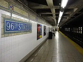 The 96th Street station is a local station on the IRT Lexington Avenue Line of the New York City Subway. Located at the intersection of Lexington Avenue and 96th Street in the Carnegie Hill and East Harlem neighborhoods of Manhattan, it is served by the 6 train at all times, the <6> train during weekdays in the peak direction, and the 4 train during late nights.